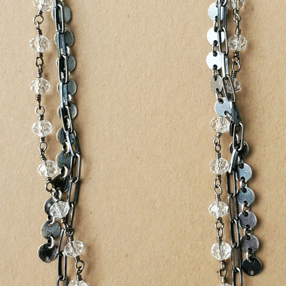 Oxidized Sterling Coin Clear Quartz Long Earrings